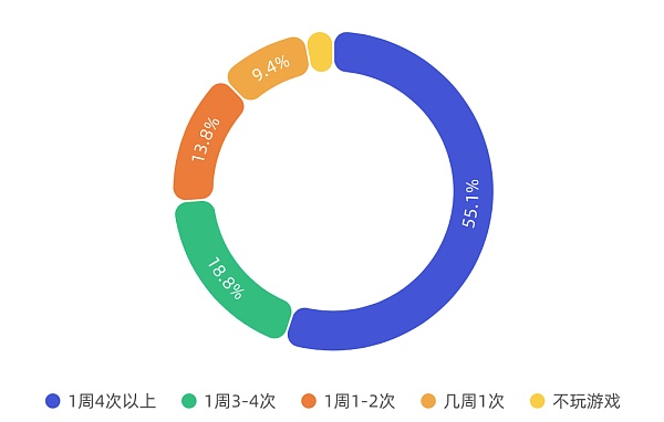 Desde la perspectiva de la frecuencia de juego, el 48,6 % de los jugadores juega más de 4 veces por semana, el 18,6 % juega 3 o 4 veces por semana y solo el 7,3 % rara vez juega.
