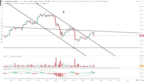 Ayer, el nivel de 4 horas rompió el canal descendente reciente y marcó el comienzo de un ligero repunte. El aumento más alto alcanzó la línea de tendencia descendente anual a largo plazo. Eje 0, a corto plazo, seguirá estando vinculado principalmente a los choques de BTC. Solo un avance fuerte por encima de la línea de tendencia anual puede revertir la situación débil reciente.La presión es de 4,5 dólares estadounidenses y el soporte es de 3,9 dólares estadounidenses.
