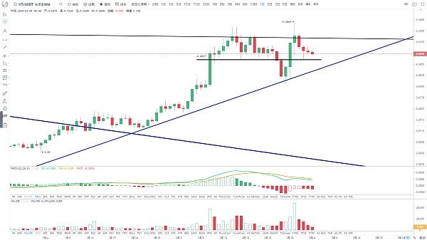 La destrucción anterior fue buena, estimuló el precio de la moneda a subir a 5,48 dólares estadounidenses en un corto período de tiempo, superando el pico del becerro de 19 años, y estuvo bajo presión de venta por la resistencia corta superior, el precio reciente. ha continuado disminuyendo ligeramente, y la cantidad de disminución puede atenuarse gradualmente. La posibilidad de una disminución brusca es poco probable. El final del triángulo ascendente formado por la línea de supresión de línea está terminando y oscilando. Es probable que continúe digiriendo la resistencia en el área por encima de la línea de supresión. En el futuro cercano, sigue siendo una postura de consolidación de choque. Después de ganar impulso, la probabilidad de un avance alcista es alta. La presión es de 5 dólares estadounidenses y el soporte es de 4,45 dólares estadounidenses.