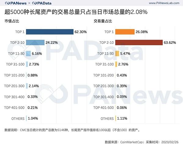 Según las estadísticas, la capitalización de mercado de los activos de cola larga clasificados después de los 100 principales representó alrededor del 4,59 %, mientras que el volumen de negociación representó solo el 2,08 %, el número de estos activos llegó a 5.046.