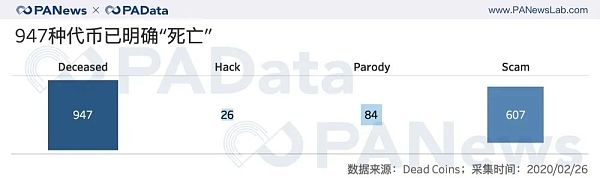 Actualmente, Dead Coins ha recolectado 1867 "monedas muertas". Después de una limpieza preliminar (eliminación de datos duplicados o anormales), PAData encontró que hay 947 monedas muertas, lo que representa alrededor del 20% de los activos de cola larga.