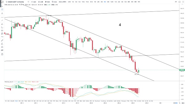 En la línea diaria, después de caer por debajo del canal de consolidación de la línea diaria anterior, siguió la rápida caída del mercado en los últimos días. La columna roja de MACD aumentó nuevamente, y el volumen de devolución de llamada también mostró una tendencia a aumentar. Hubo no había señales de detener la caída y estabilizarse en general, y el promedio móvil también estaba en una tendencia bajista. Después de alcanzar el soporte del canal descendente en 4 horas, comenzó a subir de nuevo a alrededor de $ 90. El indicador estaba en el área de sobreventa, y había una demanda de un rebote a corto plazo.