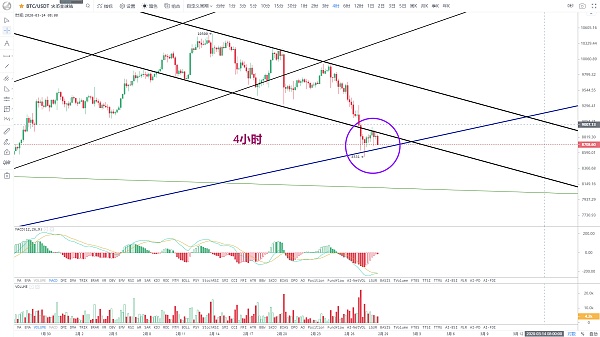 Tendencia de 4 horas, el precio actual está en el borde inferior del canal de tendencia bajista que retrocedió a $ 10,500 y el final del triángulo formado por la línea de tendencia alcista anterior. El volumen de negociación continúa debilitándose y el mercado está a punto de cambiar. Es más difícil. Una vez que el mercado cambie a la baja, será difícil mantener el soporte bajo de ayer de $8531. Habrá una alta probabilidad de continuar alcanzando nuevos mínimos. Múltiples promedios móviles en los indicadores también han comenzado a disminuir. tiempo y espacio para que se forme una tendencia alcista Actualmente, la situación general sigue siendo volátil y a la baja, y todavía tenemos que esperar para comprar el fondo.