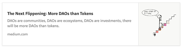 Como dije en una de mis publicaciones anteriores, cada vez es más claro que la cantidad de DAO solo aumentará y la relación entre estos tokens y DAO solo se fortalecerá. Más experimentación es una victoria en sí misma, y la implementación de estas ideas en el ecosistema Ethereum más amplio no es tan confuso como podría parecer.