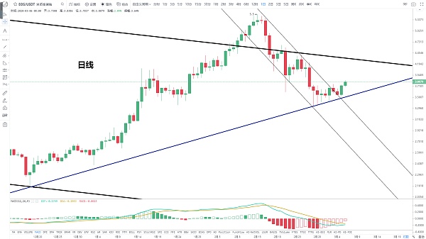 El rebote de los últimos dos días es más fuerte que el de otras monedas principales, pero aún se reduce. Después de que el precio fluctúa a lo largo de la línea de 5 días durante muchos días, comienza a subir. La línea de 5 días cruza la línea de 10 días. El volumen puede mantenerse. La columna roja se acorta y la línea indicadora tiene una tendencia de cruz dorada. La fuerte presión todavía se encuentra en la línea de supresión de la línea anual que conecta los picos respectivos en 18 y 19 años. El fuerte soporte se encuentra en la línea ascendente de la primera etapa a mediados de diciembre del año pasado. La tendencia general de la dirección general está en los dos. El extremo del triángulo formado por la línea está oscilando, esperando un cambio en el mercado para elegir un avance, siempre que el soporte de la línea de tendencia no se rompe, continúa manteniéndose, la presión a corto plazo es de 4 dólares estadounidenses.