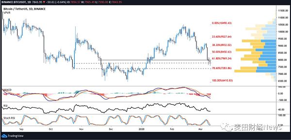 Al mismo tiempo, Bitcoin también cayó por debajo del soporte de $7800 esta mañana y comenzó a acercarse al rango de soporte clave de $7300 a $7500.