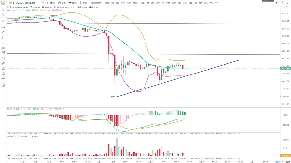 En general, el período de 4 horas se mantuvo dentro del triángulo ascendente formado después de la fuerte caída reciente. Anoche, el rebote fue impulsado por el aumento de las acciones de EE. UU., pero la fuerza fue limitada. Es difícil formar un rebote relativamente fuerte. en el corto plazo. El precio actual ha caído por debajo de 4 A la mitad de la hora Bollinger, la columna de volumen largo MACD comenzó a debilitarse por encima del eje 0. Las líneas rápidas y lentas tienen una tendencia aplanada. El impulso alcista a corto plazo es insuficiente La cabeza está arriba, el volumen de negociación está coordinado y rompe el escote de doble fondo potencial de 4 horas para suprimir el punto más alto de 5950 dólares estadounidenses, y luego se espera que pruebe el mínimo anterior 6400-6500 fuerte Presión. El soporte inferior actual es la línea de tendencia alcista. El próximo punto de caída del nivel de 4 horas es 4880 dólares estadounidenses, y el soporte a corto plazo aumentará en aproximadamente 30 dólares estadounidenses cada 4 horas. Las operaciones a corto plazo pueden prestar atención a estas posiciones En la actualidad, el rango general del triángulo se mantiene y se selecciona la dirección.