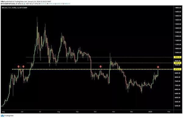 Si los alcistas logran cerrar en el techo actual de $8700, el nivel de $9400 se convertirá rápidamente en un área muy esperada para los comerciantes de Bitcoin. Este nivel de precios fue un soporte extremadamente fuerte entre julio y septiembre del año pasado, apuntalando el precio de BTC después de tres rondas de fuertes caídas. Una ruptura por encima de este nivel restablecerá un soporte sólido para Bitcoin, ya que es probable que los alcistas intenten tocar el nivel clave de $10,000. la