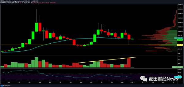 A juzgar por el gráfico mensual de líneas K, debido a la fuerte caída del 12 de marzo, el precio de cierre de Bitcoin en marzo ya estaba por debajo del promedio móvil de 20 meses, y también cerró por debajo de $6500 por primera vez en los últimos 11 meses. .