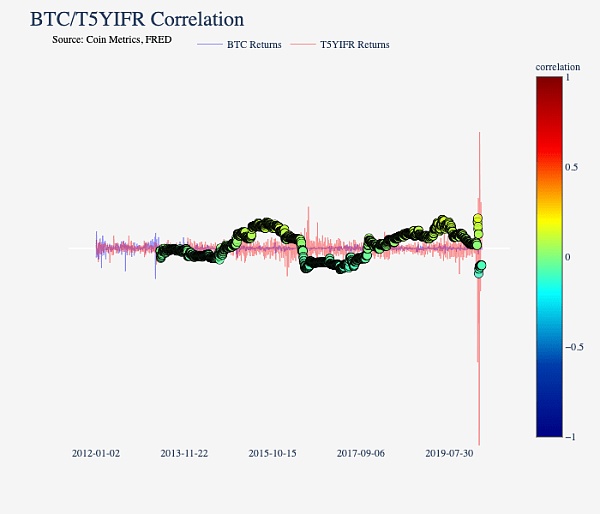 A pesar de la incertidumbre a corto plazo en medio del brote global, este podría ser un punto de inflexión a largo plazo para bitcoin si los bancos centrales de todo el mundo continúan inyectando dinero en las economías a un ritmo histórico. El gráfico a continuación muestra la correlación entre BTC y la tasa de inflación esperada de 5 años de la Fed de St. Louis (T5YIFR). Teóricamente, si Bitcoin se usa como un activo de refugio seguro durante tiempos de inflación monetaria, el precio de Bitcoin debería aumentar a medida que aumenta la tasa de inflación esperada (y viceversa). Curiosamente, la correlación de Bitcoin con T5YIFR también se disparó el 12 de marzo cuando la Reserva Federal actuó en respuesta a la pandemia mundial.
