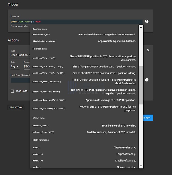 En la actualidad, el precio de Bitcoin ya no está en el rango alcista, sino que fluctúa en un amplio rango en cierta área, lo cual es extremadamente inestable. Solo cuando sube a cierto nivel, los usuarios pueden creer que Bitcoin ha vuelto a la normalidad nuevamente. Supongamos que esta cifra es de 9.000 dólares estadounidenses, es decir, la condición de activación de nuestra estrategia cuando el contrato de bitcoin supera los 9.000 dólares. En el espacio de la estrategia FTX, la condición de activación requiere que el usuario seleccione una fórmula de función, por lo que esta condición se puede seleccionar: