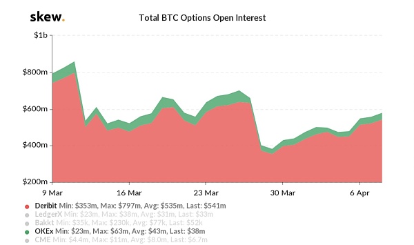 El interés abierto de las opciones de Bitcoin en la plataforma Deribit aumentó de menos de 350 millones de dólares estadounidenses el 29 de marzo a 4 $541 millones el 8 de marzo. Este es un aumento constante en comparación con el interés abierto durante el último mes. El interés en OKEx ha mantenido un aumento similar, y el interés abierto en OKEx también aumentó de $23 millones a $38 millones.