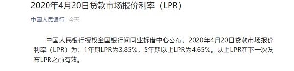 El Banco Popular de China autorizó al Centro Nacional de Financiamiento Interbancario a anunciar que la tasa de cotización del mercado de préstamos (LPR) el 20 de abril de 2020 es: LPR de 1 año es 3.85% y LPR de 5 años o más es 4.65%. El LPR anterior es válido hasta el próximo lanzamiento de LPR.