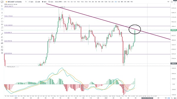 Ayer y hoy, la fuerte postura de BTC se demostró plenamente. Ha atravesado múltiples áreas de resistencia continuamente. En la actualidad, la resistencia a corto plazo anterior es el área de supresión de la línea de tendencia descendente a largo plazo que conecta 13,900 y 10,500, que está aproximadamente entre 9,550 y 9,600 dólares estadounidenses. Esta posición Una vez que se establezca el avance, la probabilidad de continuar alcanzando la marca de $ 10,000 y el pico del mercado a principios de año en 10,500 aumentará considerablemente. El precio actual se ha mantenido por encima del nivel de retroceso de Fibonacci del 50%. desde el pico de 19 años. Esta área construirá un fuerte soporte, y el pull-up a corto plazo es demasiado rápido, y está cerca de la línea de resistencia de tendencia superior. En la actualidad, no se recomienda perseguir más alto, para vea si puede continuar abriéndose paso, o dar un paso atrás en el soporte cuando encuentre resistencia. Teniendo en cuenta la entrada, el mercado actual está vacío. Las emociones son altas, y aquellos que persiguen más alto están ingresando gradualmente al mercado. Sea cauteloso en este momento. El soporte a corto plazo es de 8 900 a 9 000 dólares estadounidenses, la resistencia a corto plazo es de 9 550 a 9 600 dólares estadounidenses y la siguiente resistencia es de 10 000 a 11 000. Esta posición es el área suprimida del 61,8 % por debajo del pico de 13 900. Aviso.