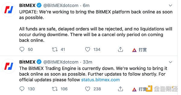BitMEX luego tuiteó que su motor de negociación no funcionaba y que se estaba reparando lo antes posible, todos los fondos están seguros, las órdenes retrasadas serán rechazadas y la liquidación no ocurrirá durante el tiempo de inactividad. Habrá un período de cancelación después de que vuelva a estar en línea. BitMEX aún no ha confirmado el tiempo de recuperación específico.