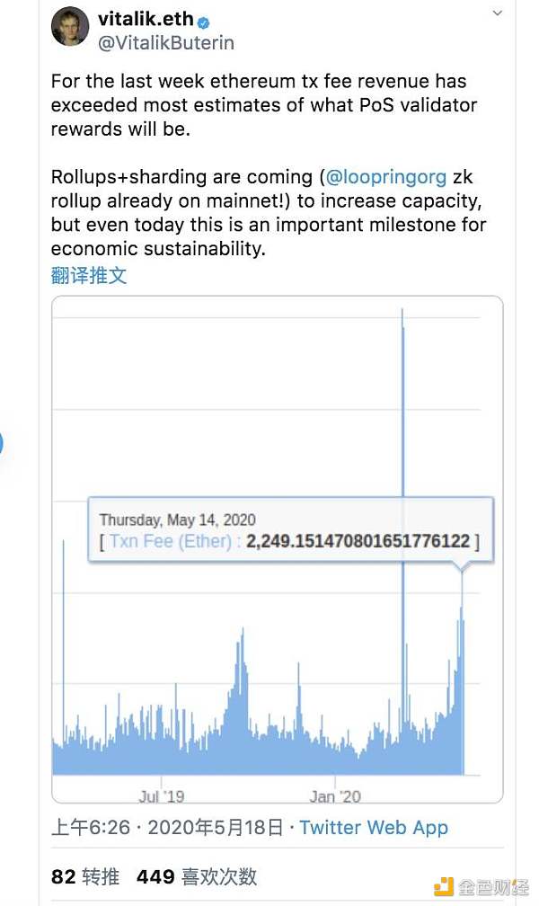 Antes de entender este tweet de vitalik, debemos entender un trasfondo: la red Ethereum actual ha entrado en un período de alta congestión. Según datos de etherscan, la tarifa de transacción diaria promedio de la red Ethereum superó recientemente los 1000 ETH. La tarifa de transacción el 14 alcanzó 2249 ETH, en comparación con la recompensa de bloque esperada de Ethereum 2.0 que es inferior a 1000 ETH por día.