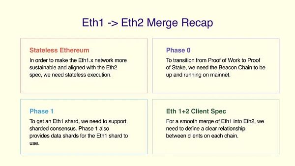 Vale la pena mencionar que el autor también mencionó el significado de "fusión de emergencia" y los desafíos que enfrenta: después de implementar la Fase 0, Eth1 y Eth2 teóricamente pueden fusionarse con urgencia, pero si Eth1 aún no ha logrado la apatridia en este momento, entonces el Se requieren nodos de Eth2 para almacenar todos los estados de Eth1.