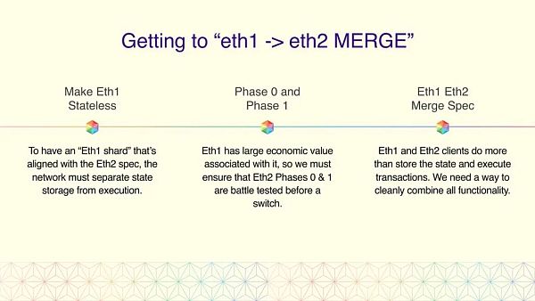 Esta parte establece las razones para fusionar Eth1 y Eth2: Para que la aplicación de Eth1 continúe funcionando, el estado y las funciones de Eth1 deben migrarse al sistema Eth2; luego introduce los tres pasos involucrados en la fusión: Eth1 sin estado , Fase 0 y Fase 1 de Eth2; luego forme la especificación fusionada.