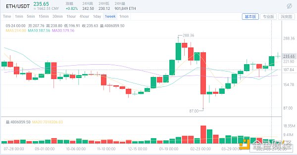XRP/EUR-2.16%Golden Finance News, la semana pasada, ETH subió hasta $ 242, un aumento de casi el 14%, lo que lideró el aumento de las monedas principales. Este aumento, el mercado cree que la alta probabilidad está relacionada con el próximo ETH 2.0, y el impulso positivo a largo plazo de ETH para iniciar un mercado en alza.