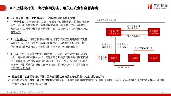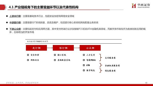 En combinación con la lógica de reemplazar los billetes, la cadena de la industria de la moneda digital se distingue aún más: el lado ascendente del banco central, el lado intermedio del banco comercial y el lado descendente de la aplicación pública. Y calculado de acuerdo a la inversión en TI que requiere la moneda digital en diferentes eslabones de la cadena industrial. Creemos que el espacio de mercado de la cadena de la industria se clasifica de la siguiente manera: lado del banco midstream > lado público downstream > lado del banco central upstream.