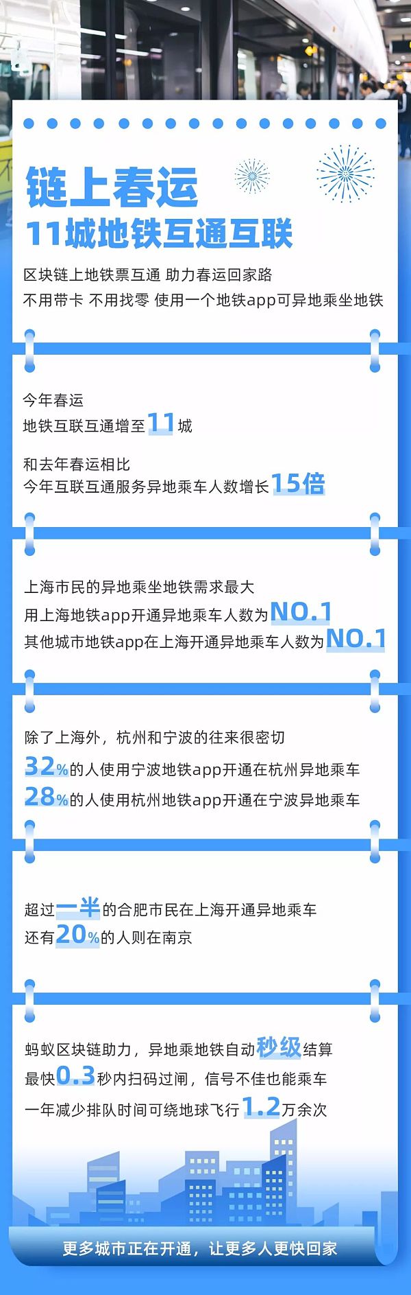 La tecnología blockchain de Alipay ha ayudado con éxito en la implementación del proyecto "Escaneo e interconexión de las principales ciudades en el delta del río Yangtze". En la actualidad, el número de ciudades interconectadas ha aumentado a 11, incluidas Shanghái, Ningbo, Hangzhou, Wenzhou, Hefei, Nanjing , Suzhou, Wuxi, Xuzhou y Changzhou, Lanzhou, etc. Cuando los residentes de 11 ciudades de todo el país van a otras ciudades, solo necesitan abrir la aplicación del metro en su ciudad y también pueden escanear el código QR para viajar en otras ciudades. Durante la temporada de viajes del Festival de la Primavera, cuando la demanda de viajes en metro a través de la ciudad aumenta considerablemente, el intercambio de boletos de metro hace que los pasajeros que regresan regresen a casa más rápido para la última "milla". En comparación con los viajes del Festival de Primavera del año pasado, la cantidad de pasajeros que viajan en diferentes lugares ha aumentado más de 15 veces hasta ahora, ahorrando tiempo en las filas y volando alrededor de la tierra más de 10,000 veces. Shanghai tiene la mayor demanda de viajes en metro en diferentes lugares: entre las 11 ciudades, la cantidad de personas que usan la aplicación de metro de Shanghai "Metro Metropolis" para abrir un viaje en un lugar diferente es la más grande, y la cantidad de personas que tienen abrió una aplicación de metro en otras ciudades de Shanghái se encuentra entre las mejores. Hangzhou y Ningbo viajan cerca: el 32 % de las personas usa la aplicación Ningbo Metro para viajar en Hangzhou y el 28 % usa la aplicación Hangzhou Metro para viajar en Ningbo.