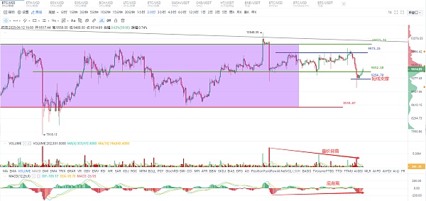 ¿Cómo lidiar con la siguiente situación? Mi opinión es que el soporte clave de la tendencia a corto plazo de 9450 que se ha enfatizado se ha roto, lo que significa que el patrón alcista a corto plazo se ha destruido, por lo que el corto plazo debería continuar siendo bajista en la perspectiva del mercado. Sin embargo, la caída de anoche cayó directamente en la línea 9000, que está cerca de la línea 8550, el soporte clave de la línea media que enfatizamos, y el mercado digirió la presión de venta a corto plazo demasiado rápido. Al mismo tiempo, como se muestra en la figura anterior, el indicador MACD obviamente no se sincronizó con el nuevo mínimo cuando el precio de la moneda alcanzó un nuevo mínimo esta vez, formando una divergencia inferior, y lo mismo es cierto para el indicador de volumen de negociación, lo que indica que la motivación interna para esta ronda de caída es insuficiente (venta activa La falta de continuidad en el mercado), lo que llevó a un rebote en los precios de las divisas. Sin embargo, la fuerza de este rebote superó las expectativas y una vez más se situó en 9450, por lo que la probabilidad de que continúen los ajustes de precios de divisas a corto plazo se reducirá considerablemente.