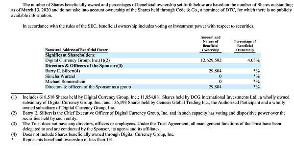 También encontramos en el informe anual de GBTC que, al 13 de marzo de 2020, su parte relacionada Digital Currency Group (Grupo de moneda digital) poseía directa e indirectamente el 4,05 % de las acciones en circulación de GBTC.