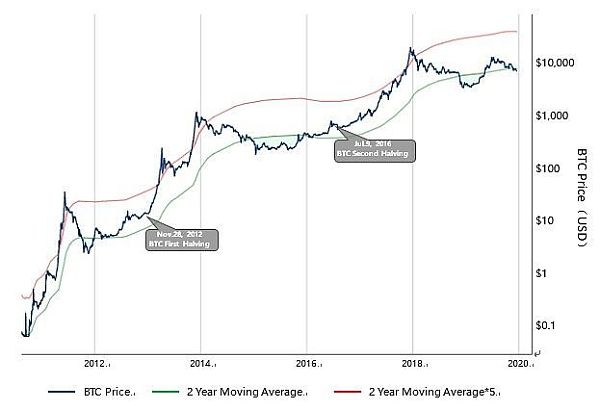 Figura 2: Bitcoin MA de 2 años y MA de 2 años*5