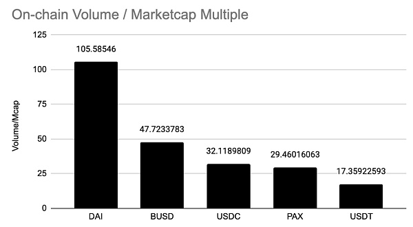 Esto se vuelve evidente una vez que consideramos la velocidad simbólica de un activo (volumen total de transacciones en la cadena (6 meses) / capitalización de mercado existente del activo). Aunque DAI tiene un suministro menor, su uso es mucho mayor que el de algunos de sus pares. Una razón importante es que la oferta de DAI es relativamente pequeña, ya que su emisión depende de los activos utilizados para CDP en MakerDAO. Por el contrario, USDT tiene una velocidad mucho más baja. Esto me lleva a creer que USDT se usa principalmente para transacciones únicas y para almacenar dólares en libros de contabilidad digitales. El valor simplemente se transfiere a un intercambio y se mantiene allí, en lugar de usarse en un producto descentralizado como un dex.