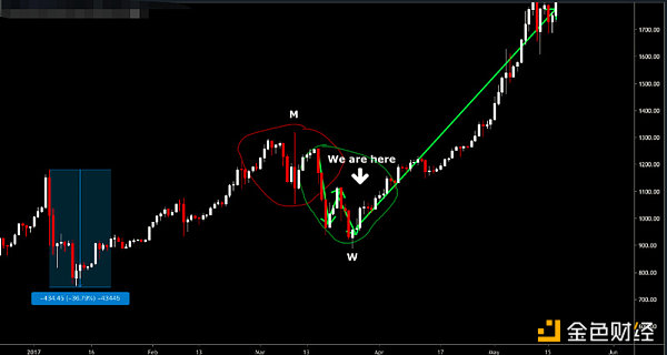 Al observar el gráfico de precios de Bitcoin de 2017, vemos que la caída del 40 % en el precio de Bitcoin desde $1180 es casi idéntica a la caída del 57 % que se produjo el 12 de marzo (jueves negro).