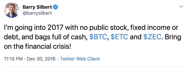 "Voy a pulir todas las acciones públicas, ingresos fijos o deuda y entrar en 2017. Solo tendré efectivo, BTC, ETC y ZEC en mi bolsillo. ¡Deja que la crisis económica se vaya!" - Barry Silbert