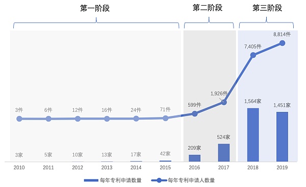 Al observar las solicitudes de patentes de blockchain de China en los últimos 10 años, más del 80% de las solicitudes de patentes se concentraron entre 2018 y 2019. Desde la perspectiva de las solicitudes de patentes de 2010 a 2019, las solicitudes de patentes de blockchain se pueden dividir en tres etapas: