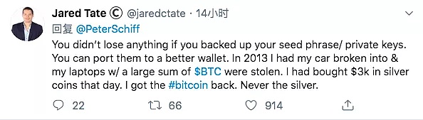 Le respondió a Peter y le dijo: "Si recuerdas bien tu frase mnemotécnica y tu clave privada, no habrá ningún problema con tu dirección. En el peor de los casos, puedes cambiar de billetera". Luego explicó con su propia experiencia: "En 2013 , mi auto fue destrozado, mi computadora portátil fue robada y los bitcoins que contenía también fueron robados. Compré muchas monedas de plata ese día, y ahora se han recuperado los bitcoins, pero las monedas de plata aún no se han recuperado. ”