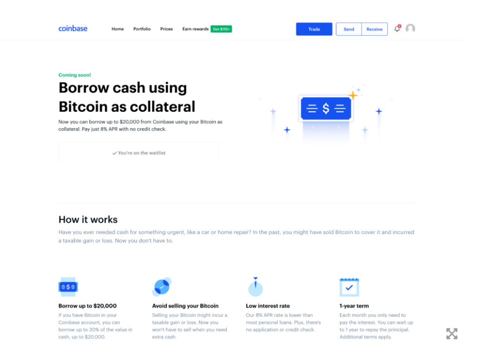 Coinbase ofrecerá préstamos en efectivo de hasta el 30 por ciento de las tenencias de bitcoin de los clientes, o hasta $ 20,000. En cuanto al tipo de interés, se cobrará un tipo de interés fijo del 8% anual, con un plazo máximo de amortización de un año.