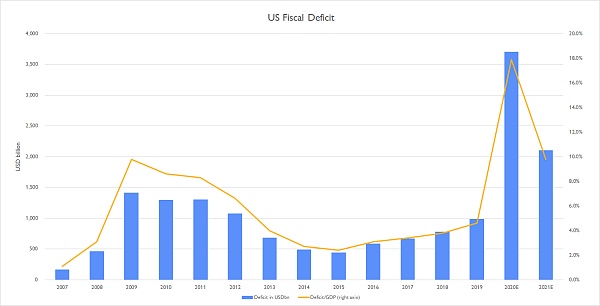 La política federal continuará respaldando la economía de EE. UU., ya que la Oficina de Presupuesto del Congreso pronostica que permanecerá una brecha de producción en los próximos años. Esto significa que, a menos que la economía se recupere rápidamente, la política monetaria de los Estados Unidos no se endurecerá. Se espera que el déficit fiscal de este año aumente a alrededor del 18% del PIB, cerca del récord de tiempos de guerra. Como se exploró en artículos de análisis anteriores, lo más probable es que la política monetaria expansiva continúe respaldando los precios de los activos reales, incluidos los activos digitales.