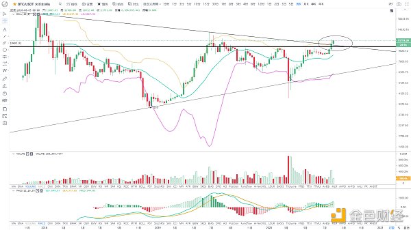 En el nivel semanal de la estructura grande, el precio actual ha superado la línea de supresión a largo plazo de 19800-14000, pero la subida actual continúa y el precio se ha desviado mucho del promedio móvil de 5 semanas. Es poco probable que esta posición continúe aumentando bruscamente. Las rupturas de cualquier línea de tendencia clave a largo plazo tendrán la acción de retroceder, por lo que no se descarta que el precio subsiguiente tenga una tendencia a retroceder para probar el soporte. El soporte de cabeza, hombros, parte inferior y escote formado en la etapa inicial está en la línea de 10,500 dólares estadounidenses. Desde el nivel semanal actual, también es El avance aún no ha retrocedido. El soporte en esta área se superpone con el largo plazo. área de soporte de línea de tendencia, formando un área de soporte fuerte estructural doble grande.