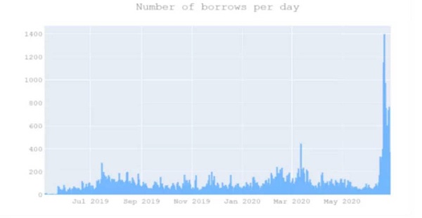 Volvamos al ejemplo de la sección anterior, siempre que el prestatario pida prestado dinero en la plataforma Compound, puede obtener el 50 % de la distribución del token COMP en la plataforma todos los días, y siempre que el valor del COMP obtenido pueda cubrir la tasa de interés de reembolso, puede arbitrar sin pérdida Esta es también la razón principal del rápido aumento en el número de préstamos a medida que aumenta el precio de COMP.