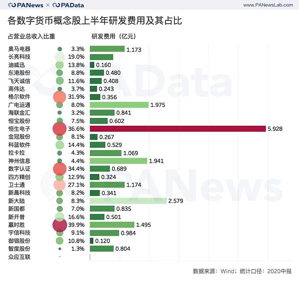 Además, para las empresas con fuertes atributos tecnológicos, la inversión en I+D también es una dimensión importante para medir la capacidad de crecimiento de la empresa. Entre las 27 empresas de concepto de moneda digital, Hundsun Electronics fue la que más invirtió en investigación y desarrollo en la primera mitad del año, con gastos de investigación y desarrollo de alrededor de 593 millones de yuanes, lo que representa el 36,6 % de los ingresos operativos totales. En segundo lugar, hay cinco empresas con gastos de I+D que superan los 100 millones de yuanes, incluidas Homa Electric, Guangdian Express, Shenzhou Information, New World y Yingshisheng, pero solo los gastos de I+D de Yingshisheng representaron casi el 40%, y las otras 4 empresas La proporción de investigación y los gastos de desarrollo no excedan el 8% de los ingresos operativos totales. Además, aunque el valor absoluto de los gastos de investigación y desarrollo de Geer Software, Digital Certification y Sifang Jingchuang no alcanzó los 100 millones de yuanes, en comparación con sus ingresos operativos totales, superaron el 30% y pertenecen a empresas que otorgan importancia a investigación y desarrollo.