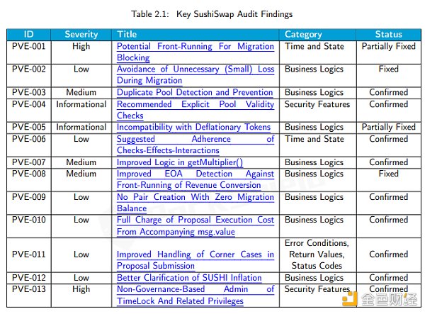 Los auditores de seguridad de PeckShield creen que el diseño general del código de SushiSwap es relativamente lógico y riguroso, y existen dos riesgos de seguridad con un alto nivel de riesgo. El mayor riesgo es que la autoridad del administrador del contrato actual no esté restringida por el derecho de gobierno de la comunidad, pero no existe una amenaza grave para la seguridad de los activos de los usuarios riesgo sistémico.