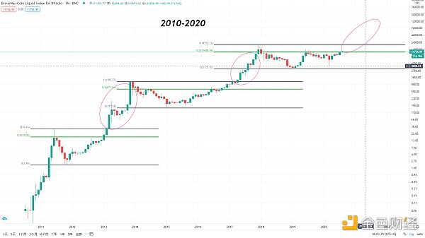 La línea mensual de hoy cierra, hoy es un día más crítico. ¿Por qué decimos eso? Podemos estudiar la tendencia pasada de BTC en la historia. La imagen de arriba muestra la tendencia mensual a largo plazo de BTC desde 2010 hasta 2020. A través de la investigación, podemos encontrar que el precio de BTC antes de cada reducción a la mitad es en el Fibonacci de la última ronda de caída máxima del mercado alcista. Qi 0.5 corre por debajo de la línea de supresión, la primera vez en 2012, la segunda vez en 2016 y la tercera vez en 2020 antes del comienzo de la reducción a la mitad. En el mercado de banda de 10.500 dólares estadounidenses, las dos líneas superiores mensuales no lograron abrirse paso y mantenerse firmes. En el mercado de Mavericks de 19 años, si bien el precio más alto alcanzó alrededor de 14.000 dólares estadounidenses, la línea mensual cerró en 11.150 dólares estadounidenses, y la entidad no fue Supere el nivel de Fibonacci de 0,5 puntos de 11.450 dólares que descendió desde el vértice del mercado alcista de 17 años.