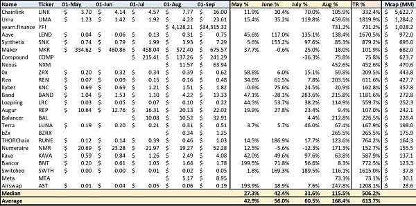 En los últimos meses, DeFi (finanzas descentralizadas) se ha disparado. Según las estadísticas del 31 de agosto, los precios de los activos cifrados de DeFi aumentaron en un promedio de 42,9 %, 56 %, 60,5 % y 168,4 % en los últimos cuatro meses.