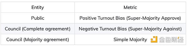 En los casos en que la participación esté sesgada positivamente (si la participación electoral es baja), se requieren más votos a favor. Con una participación negativa, requiere más votos negativos. Para las propuestas del consejo, solo se requiere una mayoría simple.