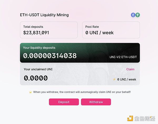 12. Nuestro objetivo es llevar a cabo la extracción de liquidez después de proporcionar liquidez, es decir, necesitamos usar la prueba de liquidez para extraer UNI. En este momento, debido a que se ha proporcionado la liquidez, cuando hacemos clic en el botón UNI en la parte superior, estamos minando En la opción ETH-USDT en la página, puede encontrar que debajo del botón Depositar UNI-v2 LP, aparece la cantidad específica de tokens de liquidez proporcionados. Haga clic en el botón de depósito para iniciar oficialmente la extracción de liquidez de UNI.