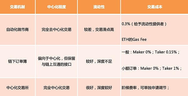 En términos de tasa de tarifa, la parte de la transacción en cadena del intercambio descentralizado tendrá una parte de la tarifa de gas, y la tarifa de manejo será ligeramente más alta que la de la transacción centralizada. Sin embargo, los activos están en manos de los usuarios, lo que es relativamente más importante para la actual ecología inestable de la moneda digital; y las transacciones en cadena pueden llamarse entre sí con otros contratos para construir conjuntamente el ecosistema DEFI.