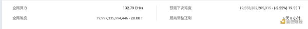La disminución en el poder de cómputo significa el ajuste de la dificultad minera. BTC.com predice que la próxima dificultad de minería de Bitcoin caerá un 2,22 %, que es de aproximadamente 19,55 T. La dificultad actual de toda la red es de 20,00 T, que es un récord.