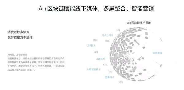 Baidu Superchain y Baidu Juping han propuesto un nuevo método de "confiar en la cadena". Al instalar un paquete de software especialmente personalizado (SDK) para la pantalla fuera de línea, la pantalla está dotada de una habilidad especial (nodo ligero original de Baidu, LCV), haciendo de la pantalla un productor de datos confiable, basado en las características anti-manipulación y rastreables de la tecnología blockchain, cargando, almacenando y depositando datos como el tiempo de reproducción de publicidad y tiempos en tiempo real, y sincronizando plataformas, clientes, etc. Lograr "fin -conexión a la cadena" y eliminar la intervención manual. Además, se complementa con tecnología de inteligencia artificial, como orientación facial precisa, etc., para mejorar el valor de la pantalla, crear un circuito cerrado de datos seguro y real, brindar a los anunciantes una experiencia de entrega más confiable y promover la transformación. del marketing offline tradicional. Este es el primer caso de monitoreo de publicidad blockchain en China, hasta ahora, 80,000 dispositivos y 100 millones de datos publicitarios se han cargado en la cadena.