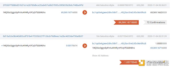 Se envió 1 BTC en la primera transacción, y los 69 369 BTC restantes se enviaron poco después. La primera transacción probablemente se envió como una transacción de prueba para garantizar que BTC no se enviara accidentalmente a la dirección incorrecta.