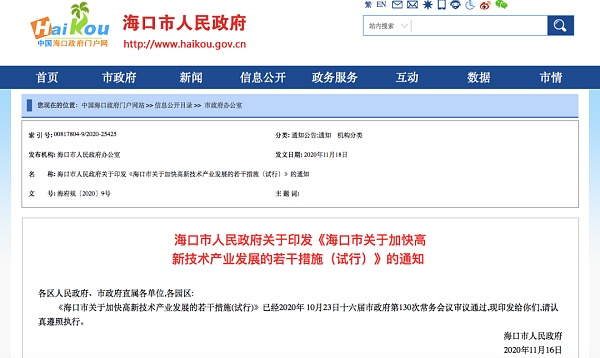 El 16 de noviembre, la ciudad de Haikou emitió oficialmente "Varias medidas para acelerar el desarrollo de industrias de alta tecnología en la ciudad de Haikou (prueba)" para acelerar el desarrollo de industrias de alta tecnología y apoyar áreas clave como circuitos integrados, tecnología de la información de nueva generación , fabricación inteligente, tercerización de servicios y salud en general Desarrollo industrial, vigencia de 3 años. Apoyar el desarrollo de la nueva generación de la industria de la tecnología de la información. Las empresas recién establecidas en la nueva generación de campos tecnológicos centrales, como la computación en la nube, big data, Internet de las cosas, blockchain, 5G, etc., tienen una contribución financiera municipal anual de más de 2 millones de yuanes (inclusive), y dos años consecutivos Las empresas con una tasa de crecimiento anual de más del 30% recibirán una recompensa de crecimiento basada en el 3% de la contribución financiera local a nivel de ciudad en los dos años anteriores, y el total recompensa no superará los 5 millones de yuanes.