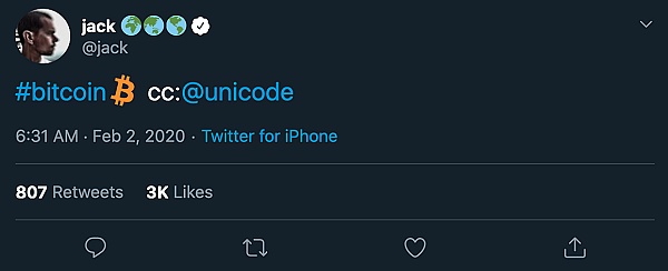 De hecho, la propuesta de Jack Dorsey de incorporar el símbolo de Bitcoin en el estándar de codificación de texto Unicode ha sido ampliamente elogiada por la criptocomunidad, incluida Elizabeth Stark, cofundadora de Lightning Labs, la empresa de desarrollo que desarrolla Lightning Network, y Justin Sun. , fundador de TRON y CEO de Bittorrent. Además, muchos conocedores de la industria de las criptomonedas también están probando el nuevo símbolo de Bitcoin en Twitter.