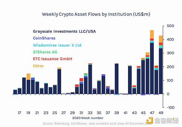 XRP/EUR-2.16%Según el informe semanal de flujo de criptoactivos de Coinshare que cubre ETP, fondos mutuos y OTC publicado el 7 de diciembre, la semana pasada el campo de criptoactivos registró la segunda entrada de inversión más grande en 2020, con un total de $429 millones.